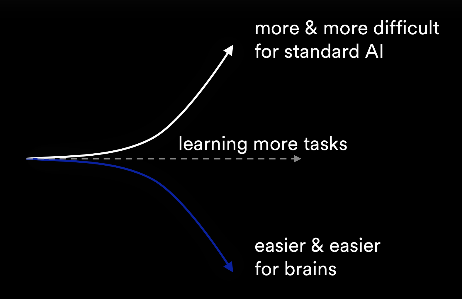 For brains, prior learning makes new learning easier. For today's AI, it's the opposite—each new capability costs more data, compute, and time. It can't accumulate enough skills for general intelligence. That's why it won't work for robotics.